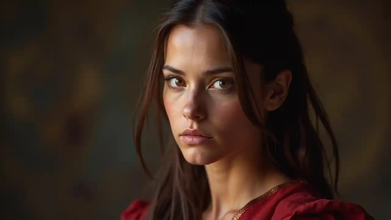 Danielpicha ya mwanamke mwenye umri wa miaka 19 mwenye ngozi nyepesi na macho ya kahawia na uso mkali na nywele ndefu za kahawia na mwili mwembamba lakini amevaa vazi la karne ya 16