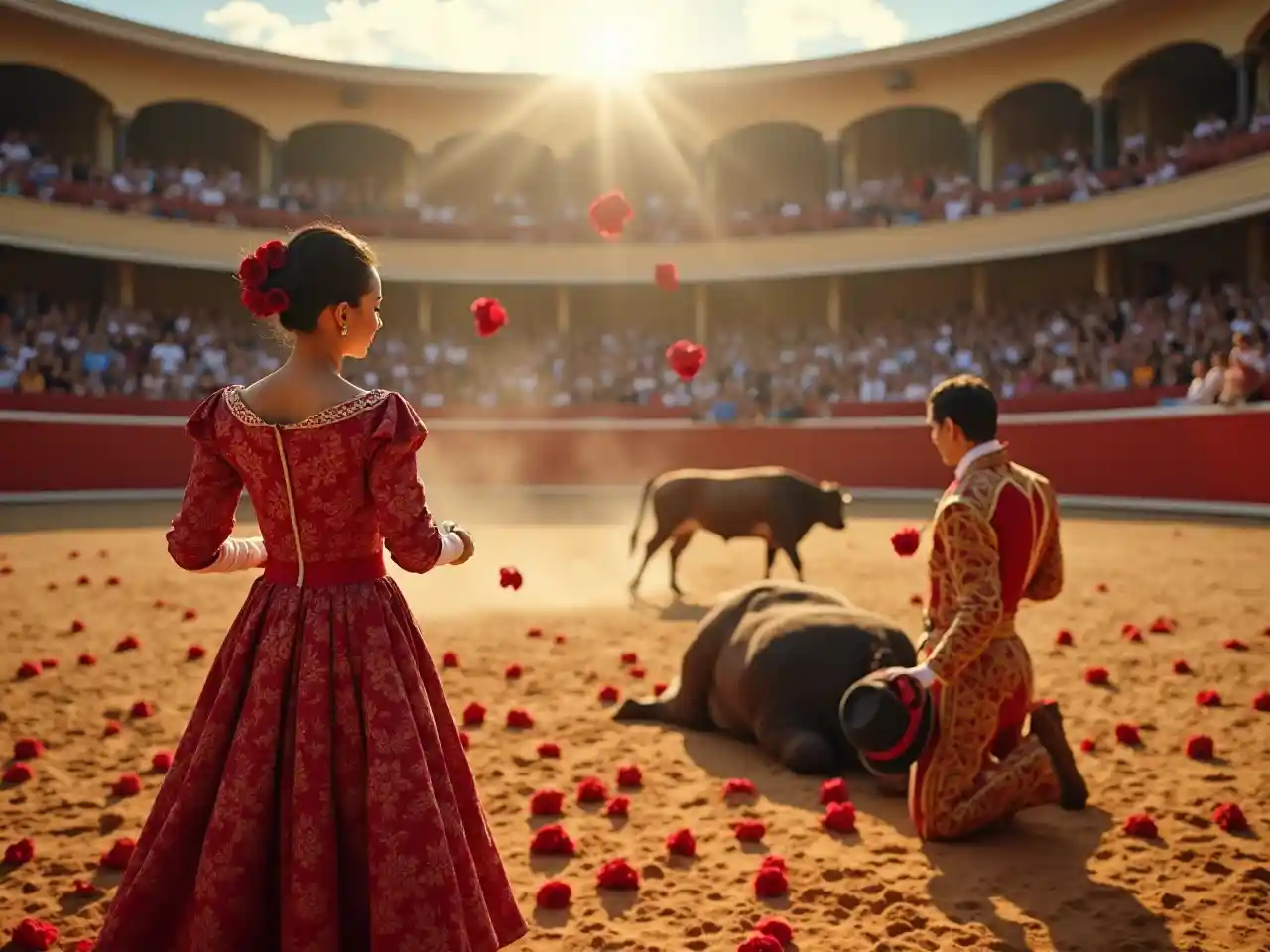 Picha ya karibu ya uwanja wa kupigana fahali uliokuwa umejaa wanawake waliovaa mavazi ya kawaida ya flamenco . Nywele zake nyeusi zimepambwa kwa keki nyembamba iliyo na ua mwekundu na yeye huangusha waridi kwenye uwanja . Ng'ombe huyo amelala chini . Katika uwanja, mpiga-damu wa mifugo anapiga magoti na kushika kofia yake huku akiinamia umati. Amezungukwa na waridi waliotawanyika kwenye mchanga . Umati uliokuwa kwenye viwanja vya maonyesho unamtupia waridi na kuunda mazingira ya sherehe . Ukungu . Nuru ya jua ya dhahabu