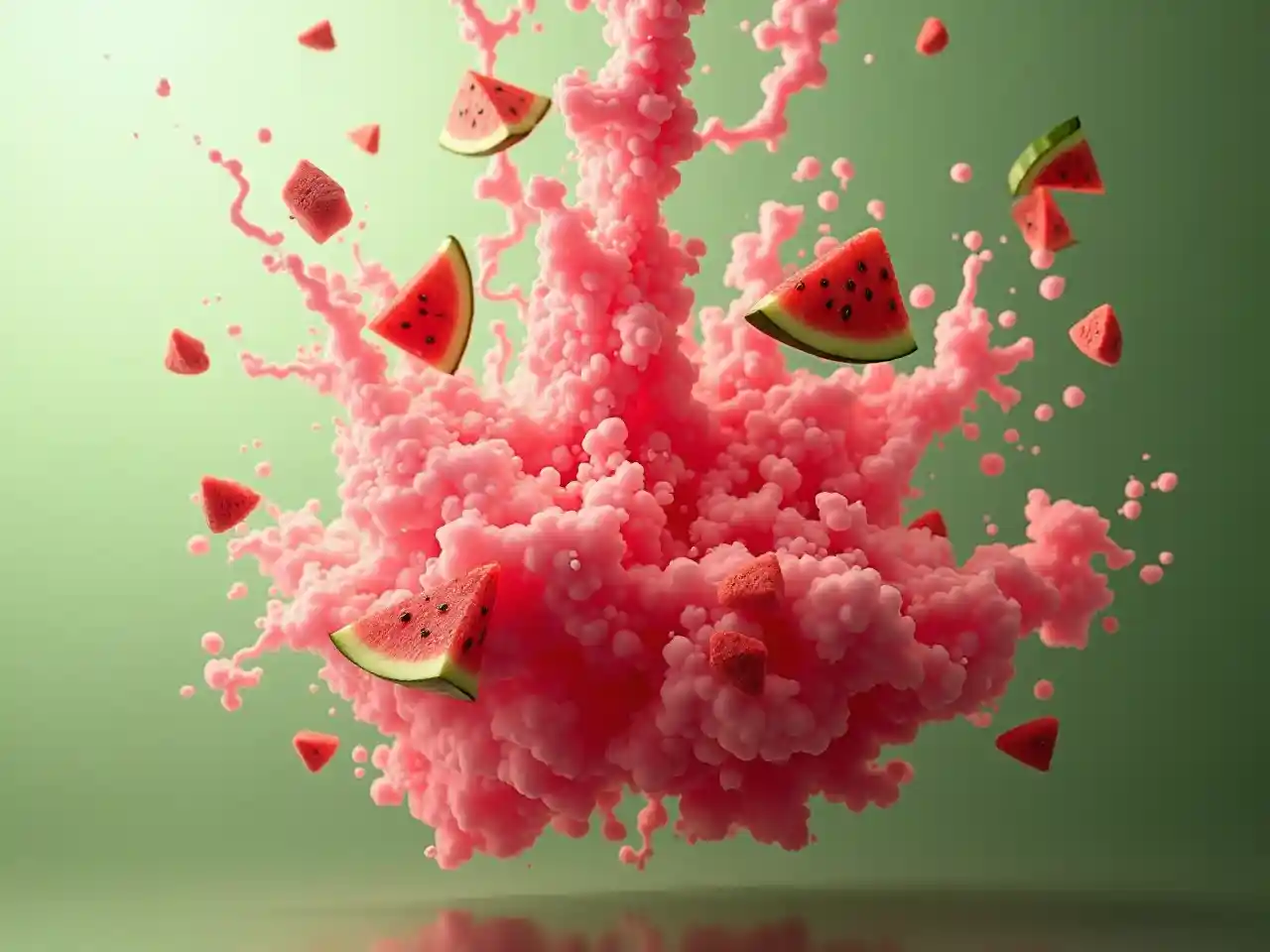 Brynnvipande vya watermelon kuelea, mchanganyiko wa kioevu, rangi ya waridi na kijani background, moshi, watermelon uwanja kuangalia, 4K photo-kweli