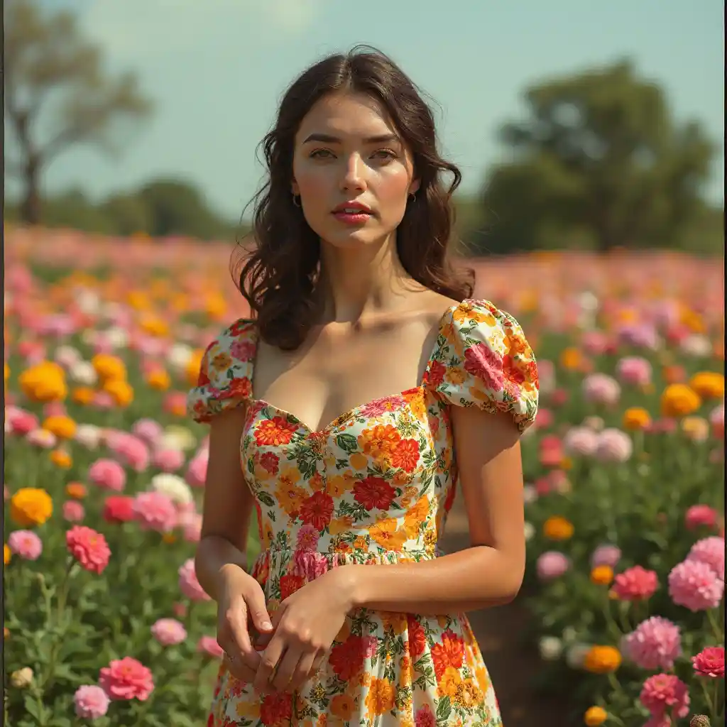 Msichana katika Blooming Garden Fashion Editorial