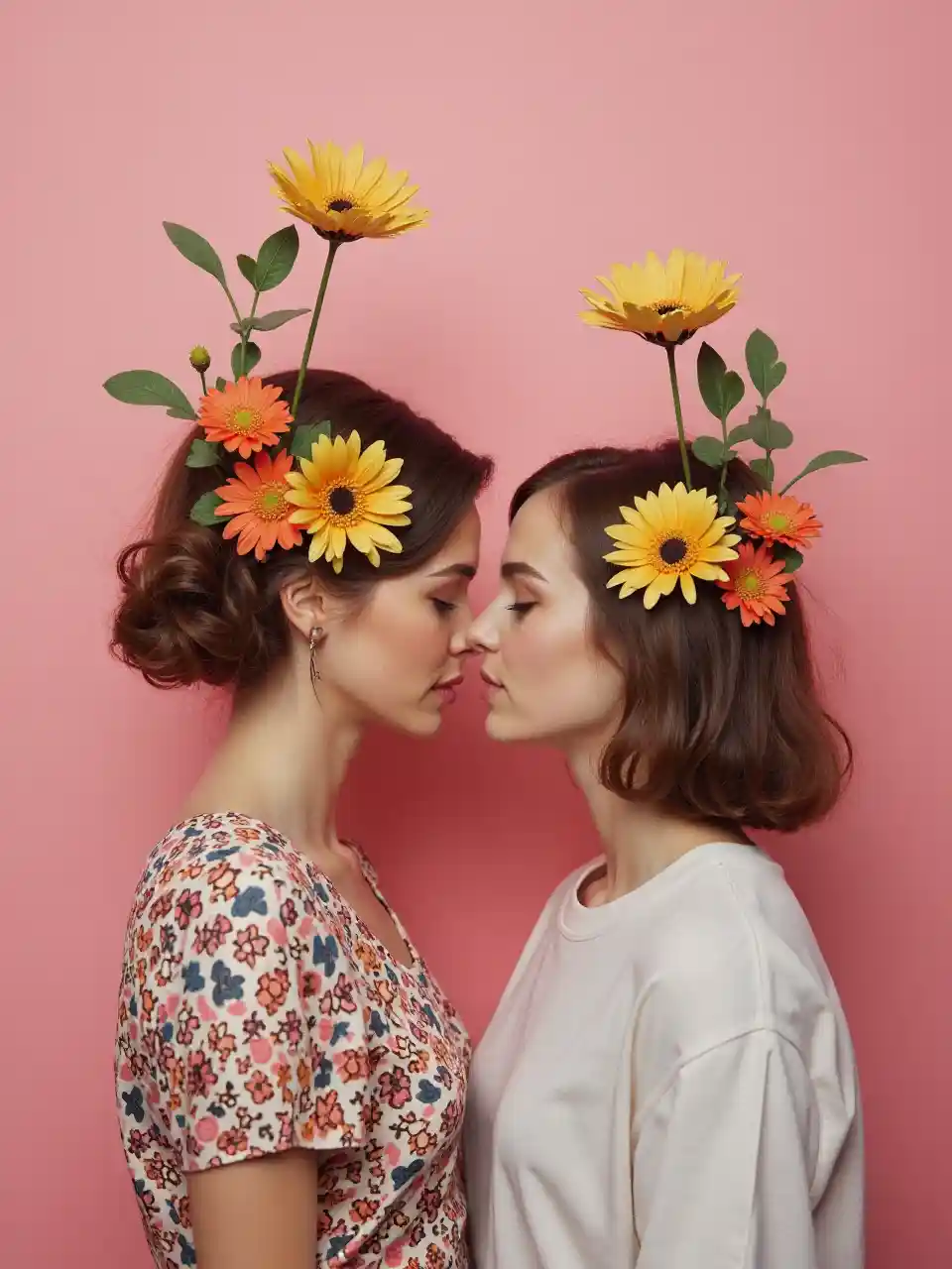 MilaWanawake wawili na maua katika vichwa vyao kusimama kichwa na macho kufungwa dhidi ya ukuta wa rangi ya waridi