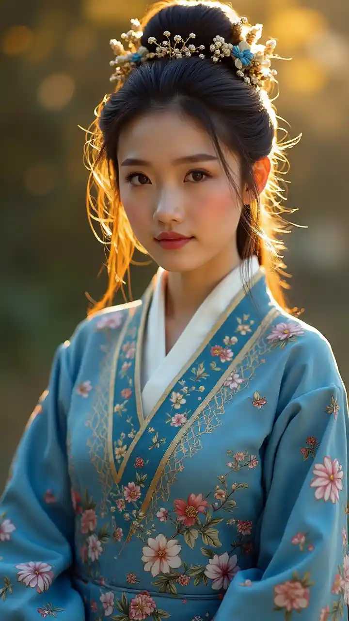 picha ya kibinafsi, kike bluu maua mavazi ya Kichina hanfu, maua, risasi ya kati, saa ya dhahabu, macho mbele