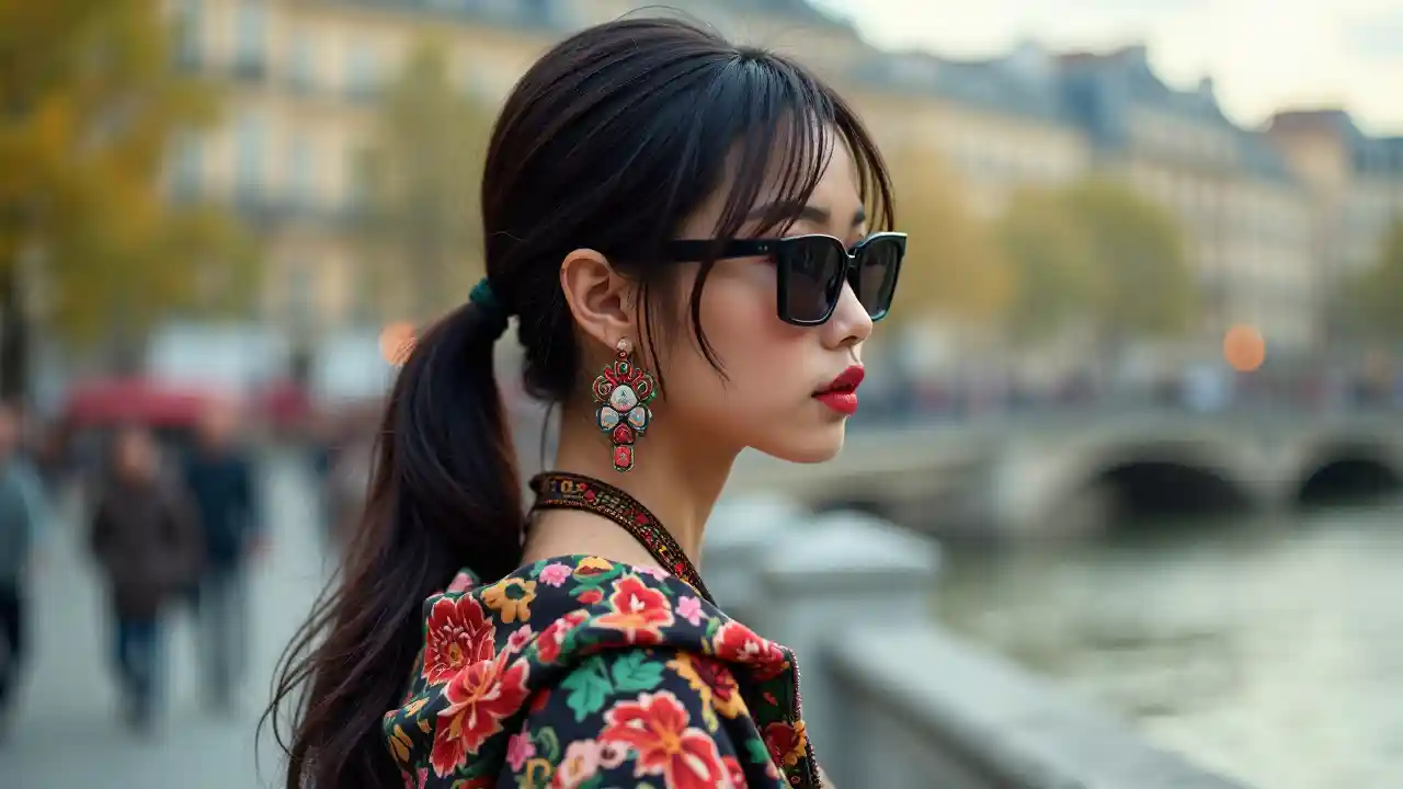 Kijana wa kike wa Asia mfano, muda bob nyeusi nywele, vipaji kubwa, mwili mwembamba, kubwa midomo nyekundu, laini make-up, kubwa ndefu maua silicone, ndefu silicone maua necklace, kigeni Aztec, Maya aliongoza, nyeusi jiometri miwani, chunky frame, maua jogging mavazi, flora hoodie, katika Paris, nyuma, 35mm lens, bokeh, alexa chung style, karl lagerfeld ponytail
