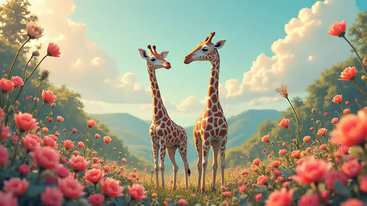 Giraffe kuzungukwa na maua yenye nguvu, aliongoza kwa Arne Thun, katika mtindo wa kufikiria wa Natalia Rak, akishiriki aesthetics ngumu. Iliyoundwa kwa ajili ya high-azimio 8k wallpaper, eneo huangaza charm whimsical na mambo subtly animated, echoing nyuso surreal ya Naoto Hattori, bado kuonekana kweli ndani ya 43:64 uwiano wa sura.