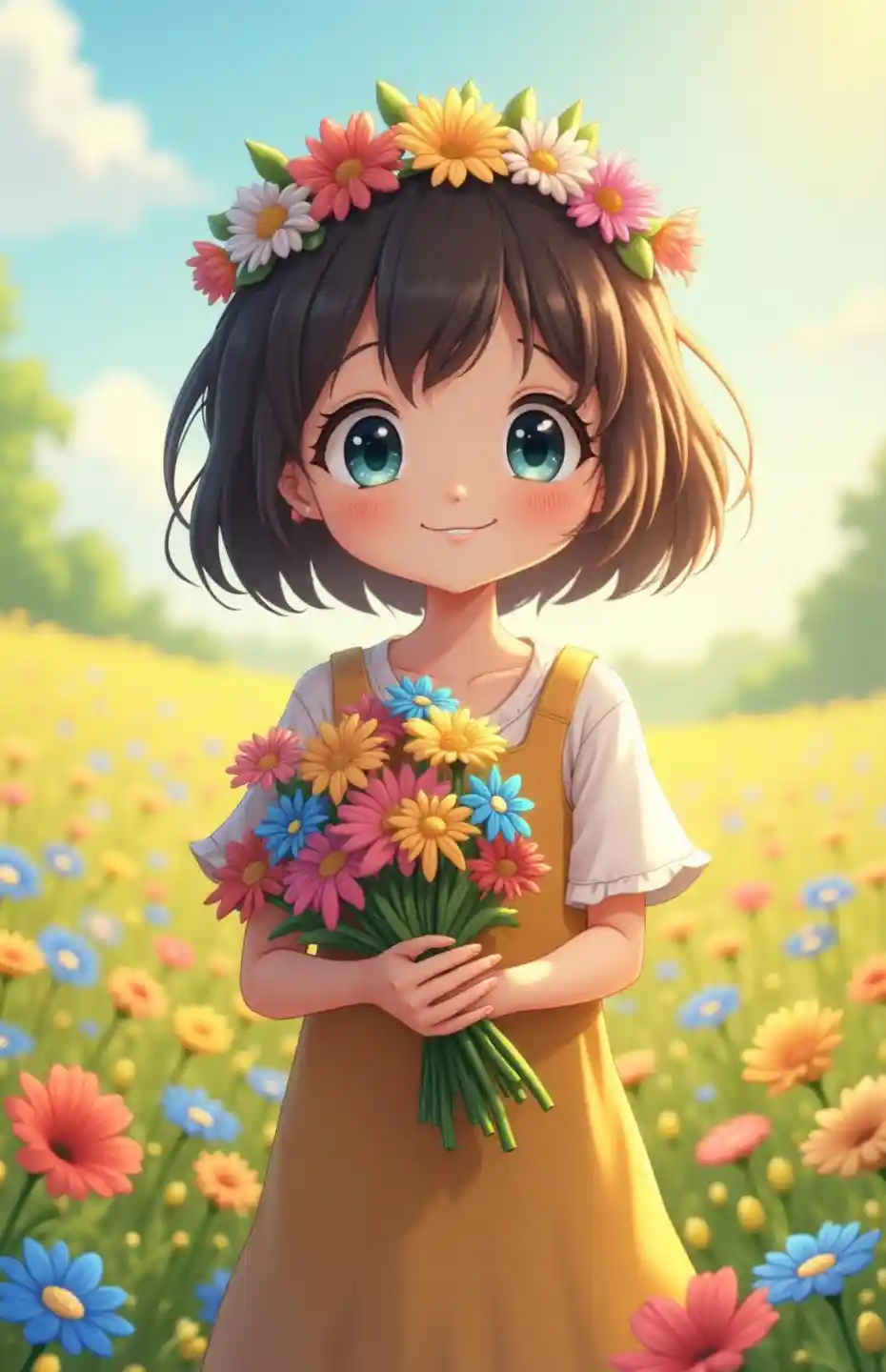 msichana cute umri na nywele fupi bob, macho ya bluu, na taji ya maua, tabasamu upole, amesimama katika nyasi jua kamili ya maua ya rangi, yeye ana bouquet ya