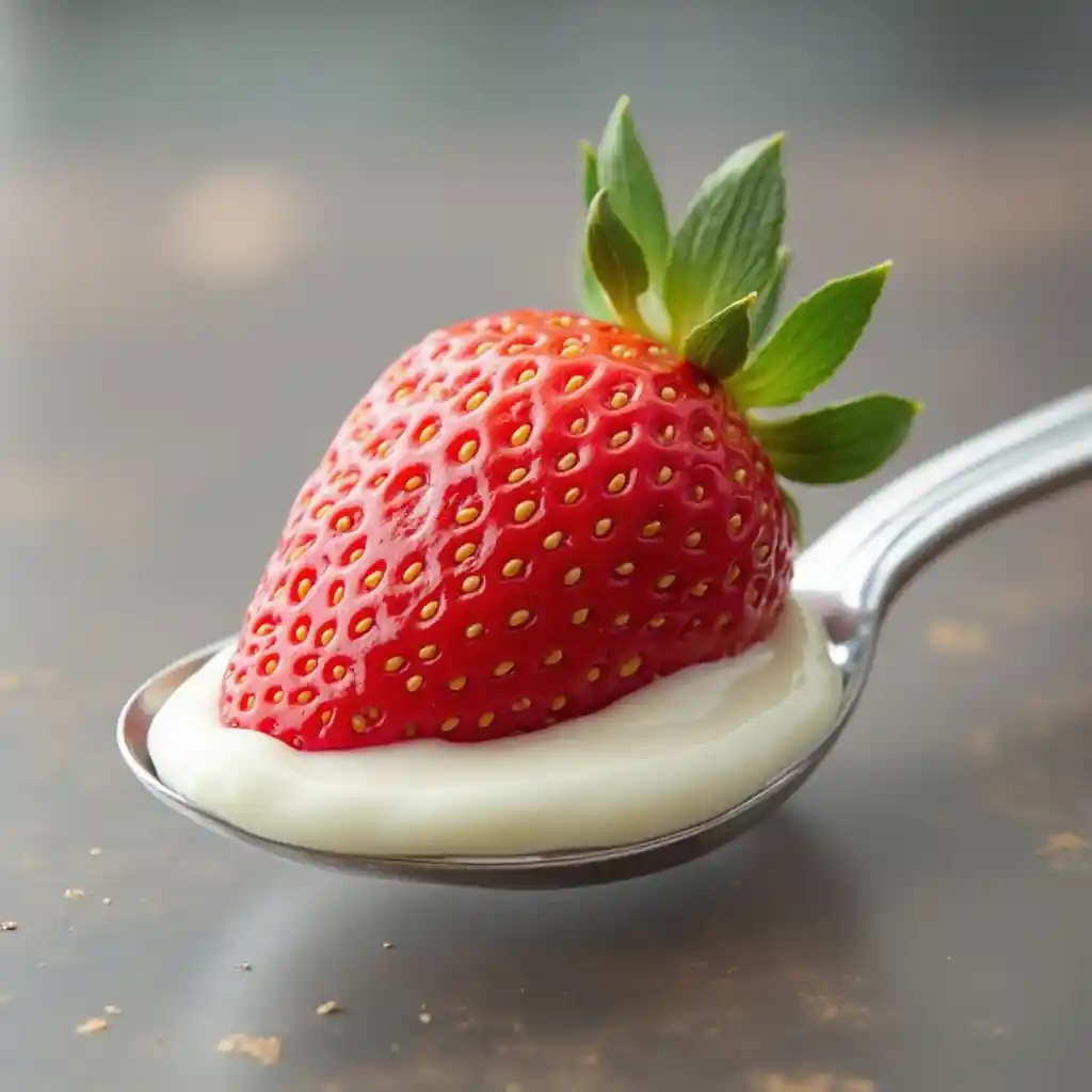 Avanusu ya jordgubbar iko juu ya kijiko na yogurt