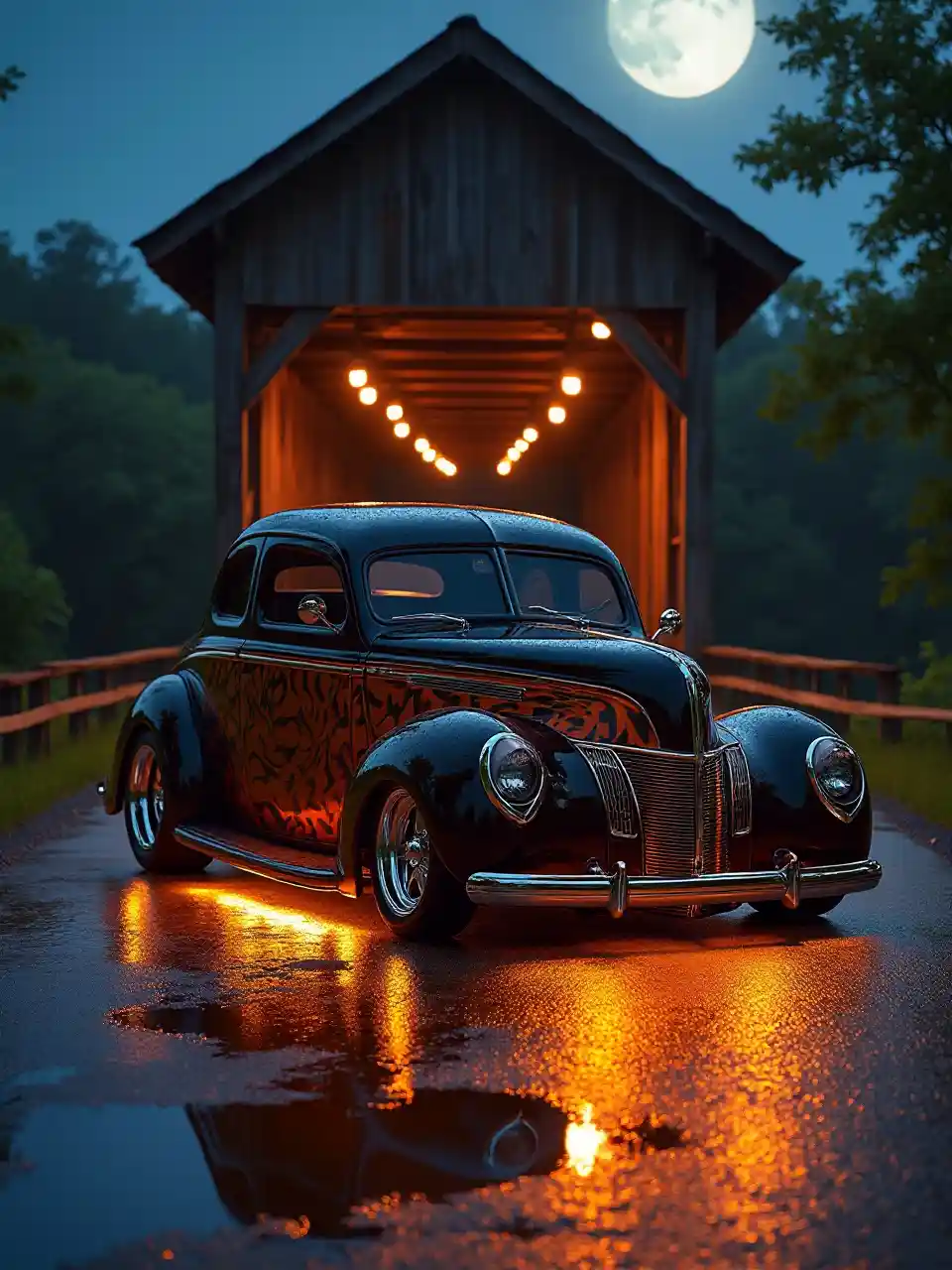 Picha ya kweli ya 1940 Ford Coupe kutoka mbele na kamera inayoelekea mbele. Gari limepunguzwa, rangi ya chuma ya tiger, rangi nyeusi, fani nyeusi ya inchi 22, na madirisha yenye rangi nyeusi. Taa neon kung'aa ni chini ya gari casting rangi ya machungwa juu ya barabara chini na karibu na gari juu ya barabara. Gari limeegeshwa kwenye mlango wa kuingia ili kuvuka daraja la zamani lililofunikwa usiku wa kiangazi. Nuru ya mwezi inaonekana kwenye madaraja, magari, na barabara zilizo na mvua, na matope yanaonekana. Picha ni katika 8K, kina sana, ubora wa juu, na azimio high panoramic mtazamo.