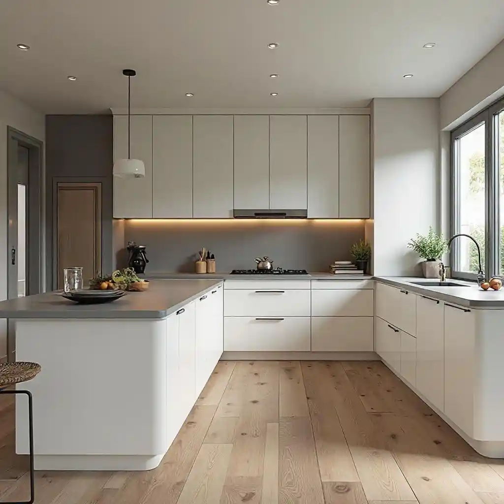 PenelopeModern kitchen, white and gray cabins, light lines, brown coffee bar,forest villa