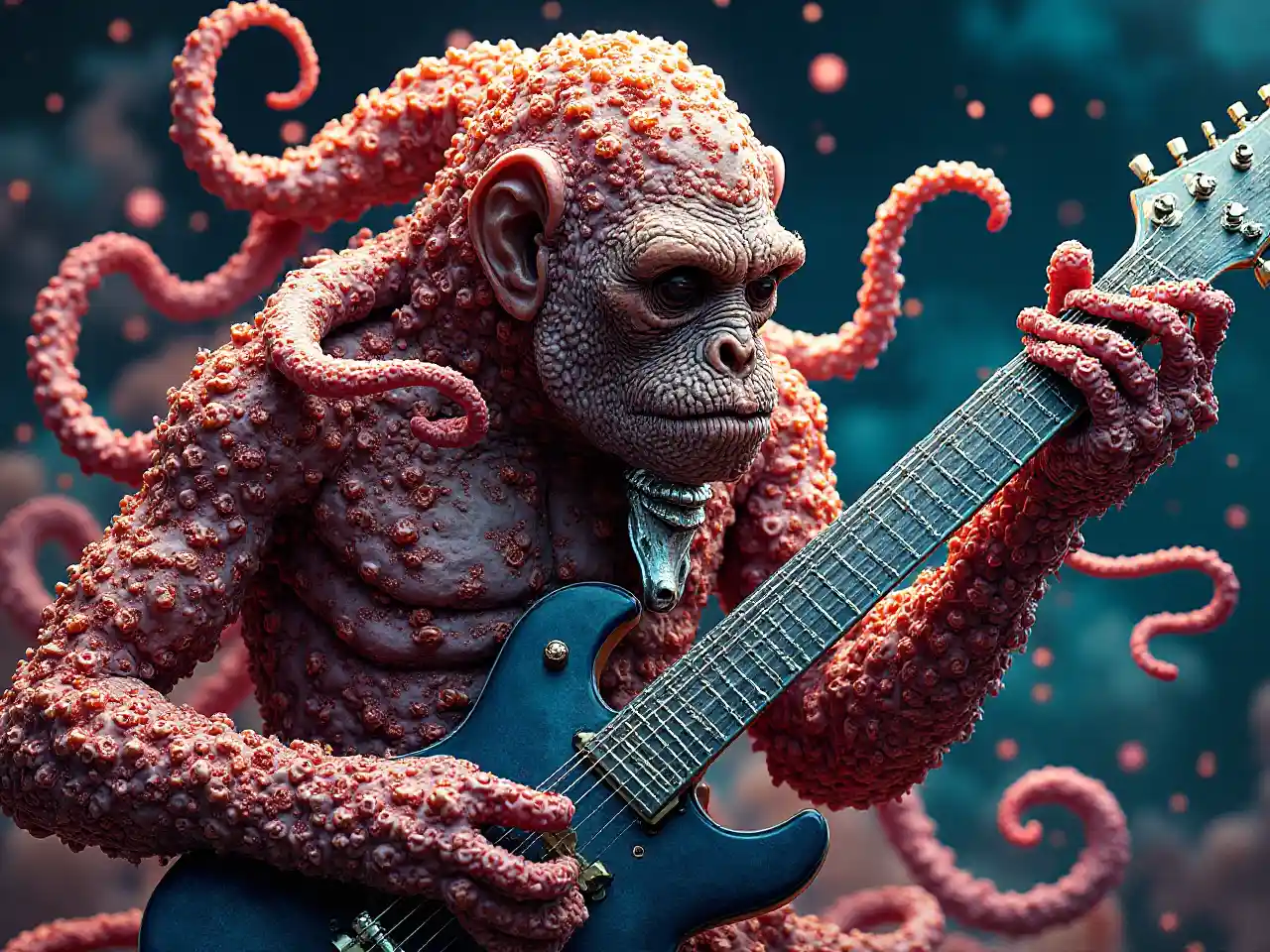 nyani octopus pepo kucheza gitaa nzito, kufanywa kwa fractal LSD na roco DMT, katika mtindo wa icons albamu, mtindo wa Robert Williams, Nychos, artofsickness66