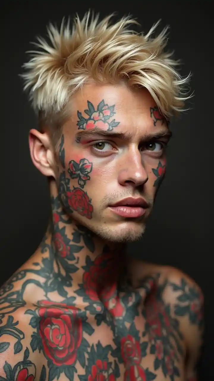 Freddy nywele fupi blonde kijana na uso wote tattoo wewe Rolling Stones album cover