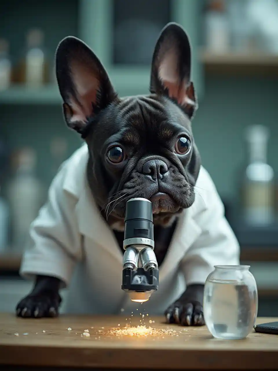 KinsleyMbwa-mwitu wa Ufaransa katika darubini. Mahali pa maabara. Akiwa amevaa koti la maabara. Sahani ya Petrie.