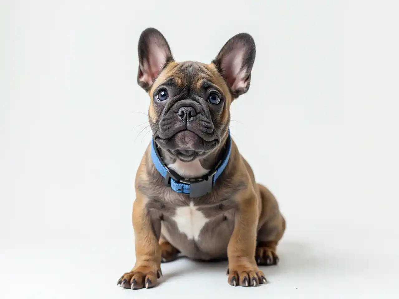 mbwa-mwitu wa Ufaransa mwenye ngozi ya rangi ya bluu, ameketi. Ana kolia ya bluu yenye jina Loki.