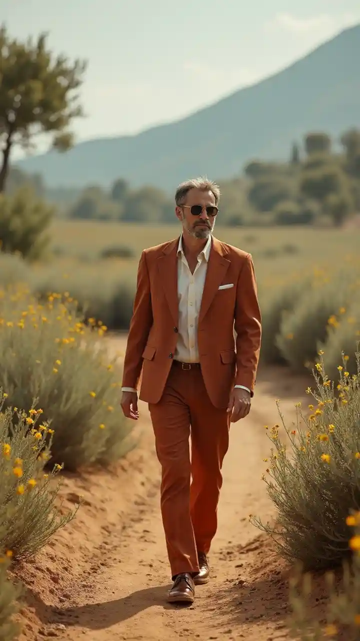 Kifaransa miaka thelathini ya umri wa mtu ultrarealism kutembea katika mazingira ya kimapenzi ya Italia kuvaa 3 vipande terracotta suti brunello cucinelli style