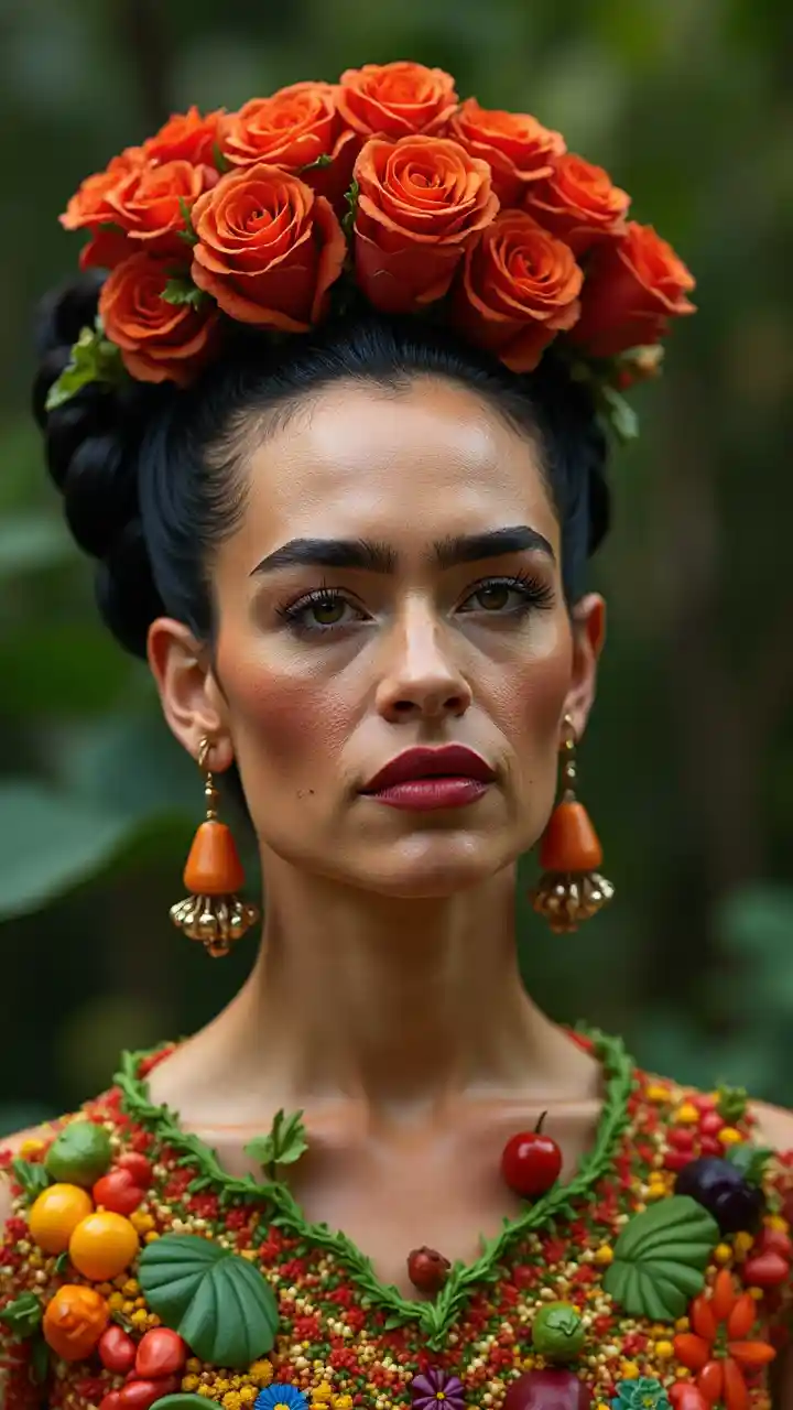 Picha ya Frida Kahlo,Kivuta-Kichwa kilichotengenezwa na mboga na mimea, rangi mkali, yenye maelezo mengi, mtindo, gazeti la mitindo, umakini, mapambo ya kuvutia, taa ya kuvutia, kina cha uwanja, kina cha ajabu, background.