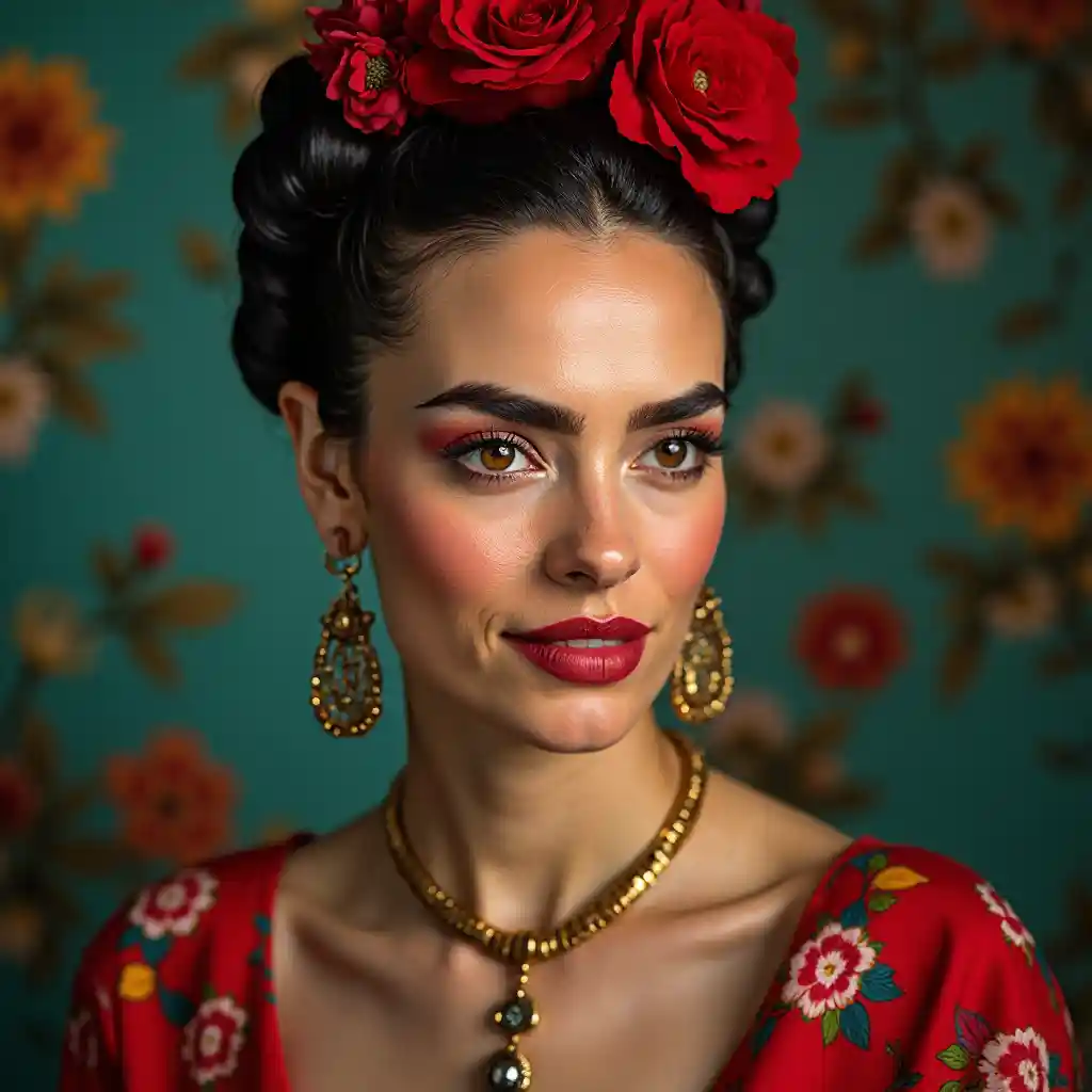 Picha ya Frida Kahlo, rangi mkali na wenye, kifahari, kina sana, mtindo, gazeti mtindo, umakini mkali, vipaji mkali, taa ya, kina cha uwanja, incredibly high kina, background blur