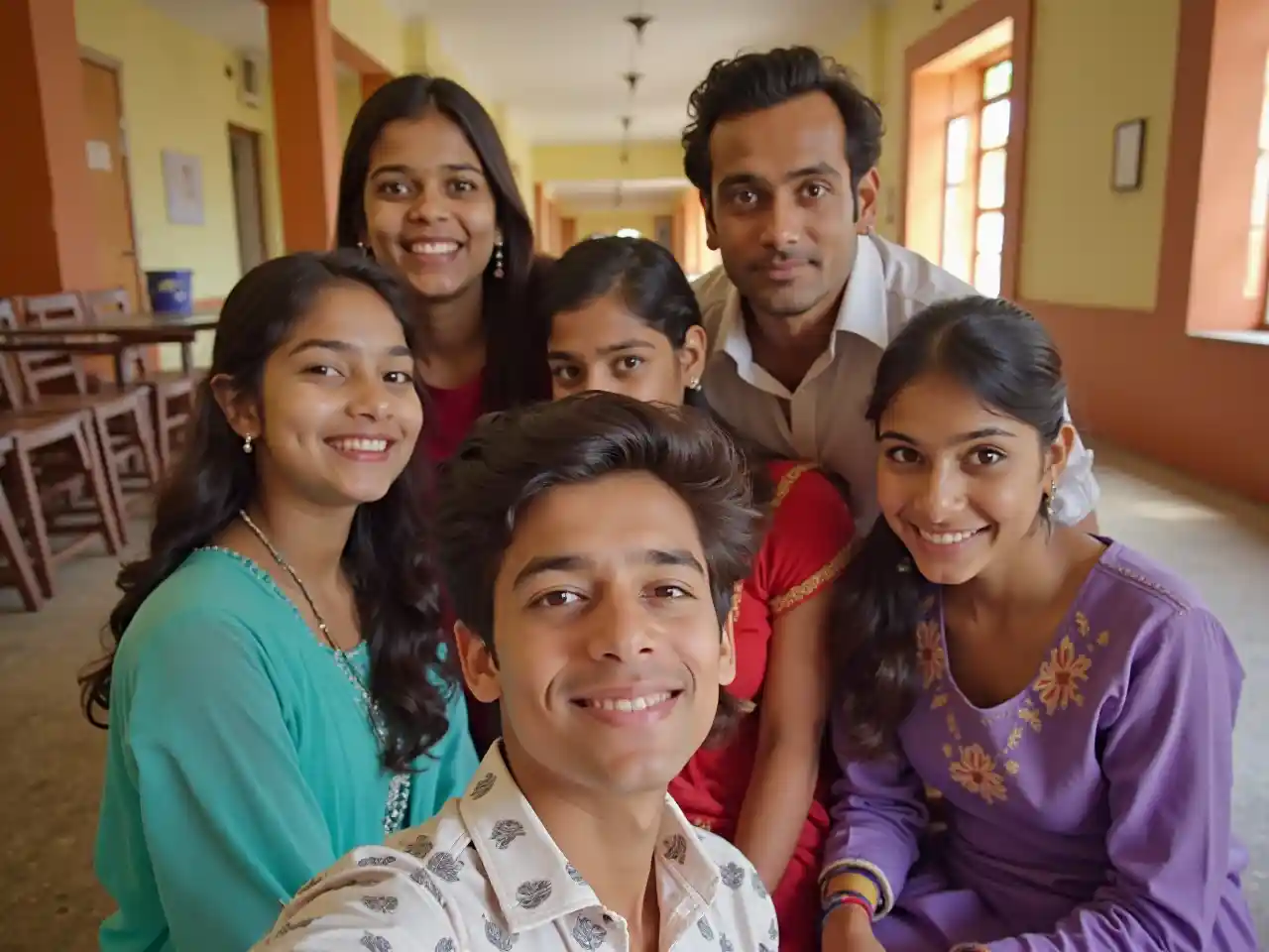 Mandhari yenye kusisimua ya ndani ya nyumba huonyesha wakati wenye uchangamfu na urafiki, na vijana watano wakiwa wamekusanyika, wakitabasamu kwa urahisi ili wapate picha ya kibinafsi. Kwenye picha ya mbele kuna mwanamume kijana mwenye nywele nyeusi na shati nyeupe lenye michoro, akichukua picha kwa uhakika, huku nyuma yake kuna marafiki wanne walioketi: msichana mwenye sari ya rangi ya turquoise na vito vyake, mwingine akiwa na nguo nyekundu na mado, mwanamke aliye na mavazi ya zambara na mitindo ya kawaida, na mwanamume kijana mwenye sura ya kawaida. Mahali hapo panaonyesha sauti za joto za jumba kubwa lililo na nguzo za mbao na viti vingi, na hilo linaonyesha kwamba watu wote wana nafasi ya nuru. Mwangaza wa kawaida unaongeza hali ya urafiki, na kuunda hadithi yenye furaha na yenye kuvutia ambayo huonyesha urafiki na mambo ambayo mtu amepata.