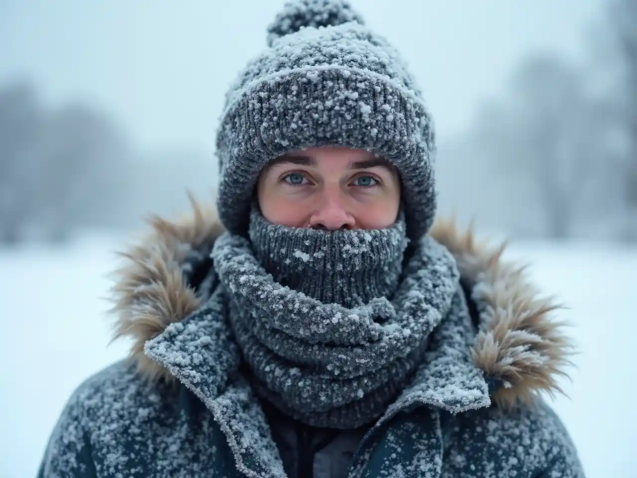 Vijana wa kiume kuvaa nguo za majira ya baridi iliyofungwa katika tabaka za barafu waliohifadhiwa katika tabaka baridi theluji na barafu katika sub zero dhoruba ya baridi na mwili wao wote na ngozi kama barafu
