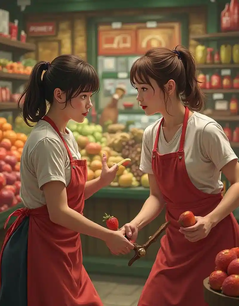 wanawake wawili katika duka la matunda wanapigana。nuns za jordgubbar。mikuki ya matofaa。wanawake wawili wanavaa vifuniko vya miguu。