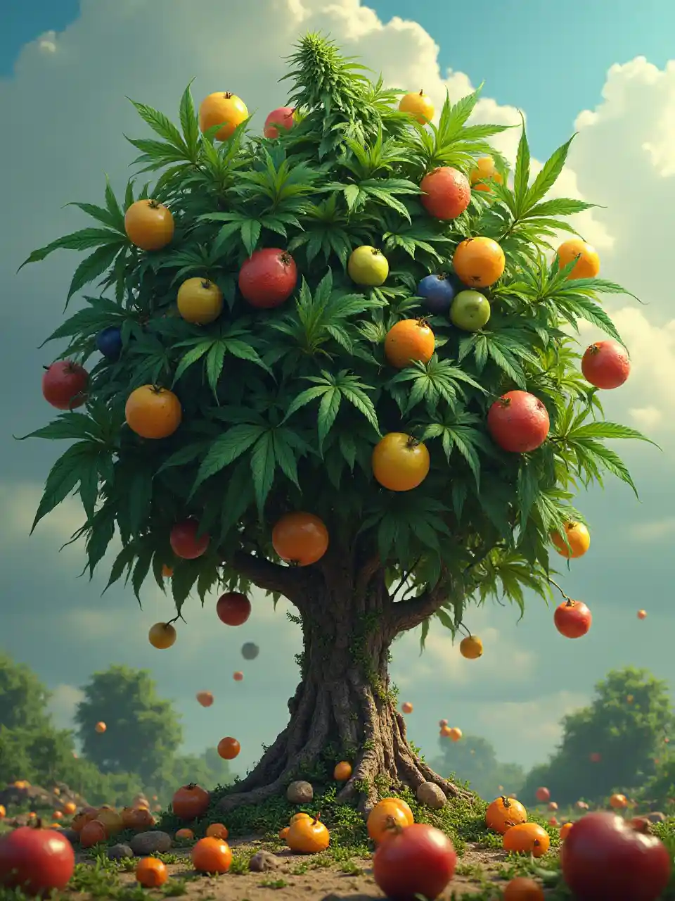 ScarlettMatunda mbalimbali yakianguka kutoka kwenye mti mkubwa wa bangi