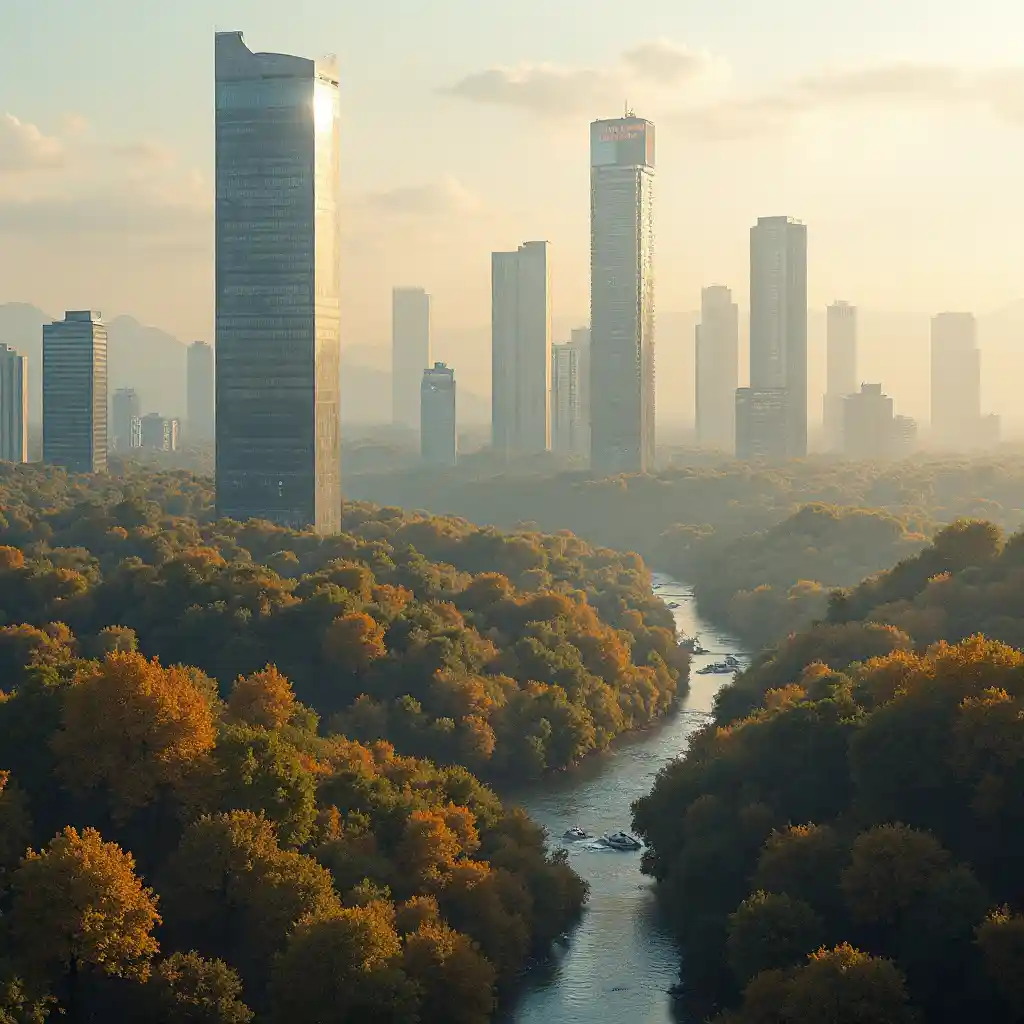 Wide Angle mji wa baadaye na skyscrapers, mji ni kuzungukwa na ukuta wa miti, mji ina milima mingi na mito, mwanga lazima laini na vivuli vya rangi ya manjano. katika mji huu kuna nyumba katika style Urusi