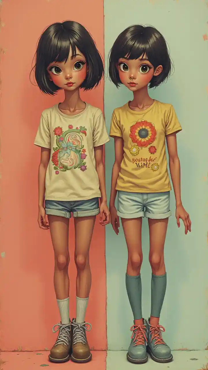 KingstonPicha ya baadaye ya wasichana wawili wenye nywele fupi wakiwa wamesimama kando ya kila mmoja, mtindo wa James Bidgood, mtazamo wa mbele, upana, maelezo ya juu, rangi za wazi