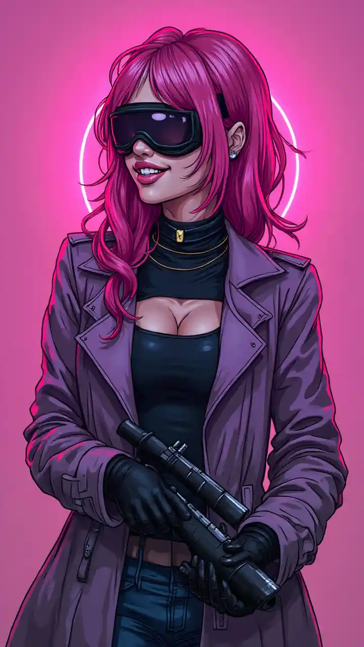(swat mtu), (pixel sanaa), kina, mwili, kinga, mask, miwani, action pose, trench coat, pink, surreal, weird, (mwili kamili sexy gamer msichana na nywele pink picha), vaporwave neon mandhari, mwanamke, picha, tabasamu, kicheko, kinywa wazi, (mwili wa juu, bust risasi, kuangalia mbali:1), nywele neon