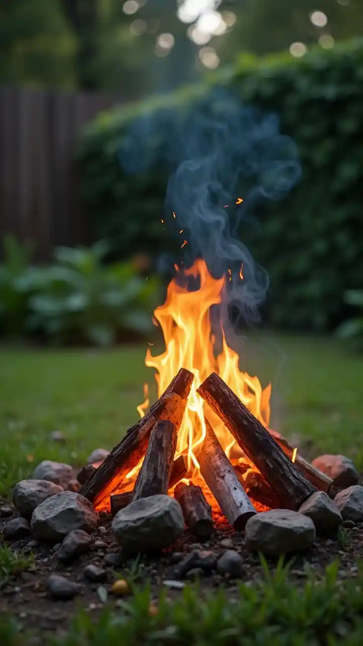 LeilaMaoni ya upande wa moto mdogo usiowashwa katika bustani, bila miale wala moshi