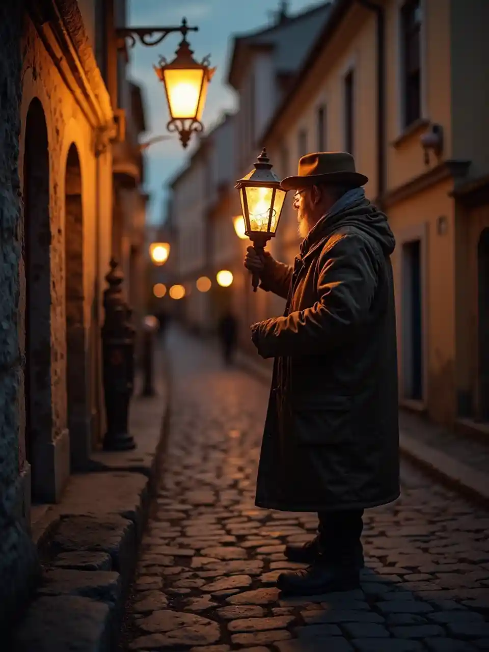 kuvutia taa gesi, taa ya kale taa chini ya anga ya jioni, mwanga laini dhahabu kutoka taa casting mwanga joto, sauti ya jioni, mitaa ya zamani, barabara cobbled, moto flicker, anga serene, anga nostalgic, vivuli ya ajabu, maelezo ya juu, mazingira ya jioni, inakari vibes ya kihistoria.