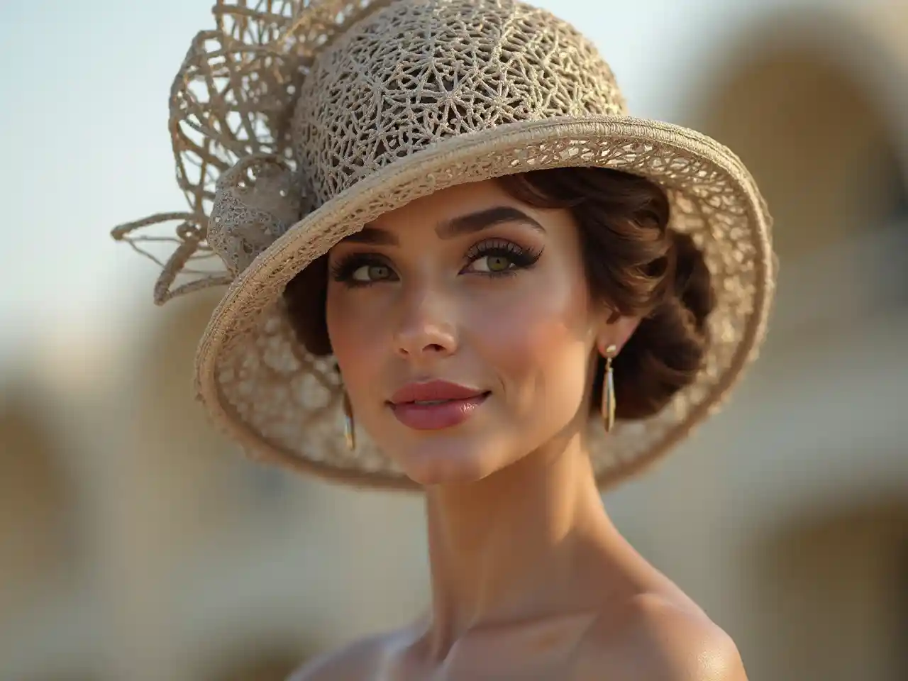 mwanamke mzuri akikabili mtindo wa juu, akiwa amevaa kipande cha kichwa kilichoongozwa na miundo ya jiometri, usanifu wa Dubai, uliovaliwa kwenye mbio za farasi