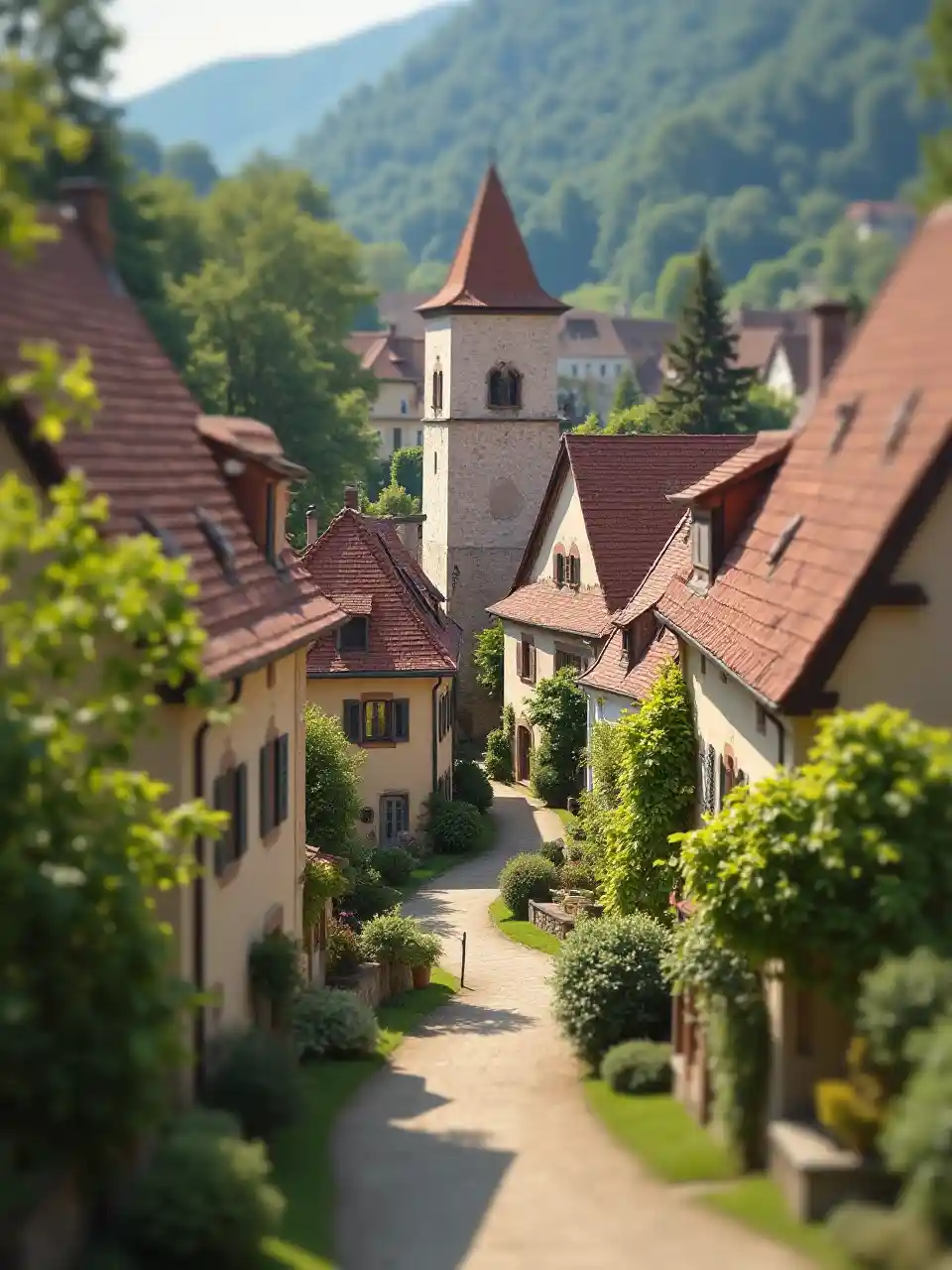 tilt mabadiliko ya picha ya kijiji kidogo Ujerumani, kina cha mtazamo, jua, usanifu wa ajabu