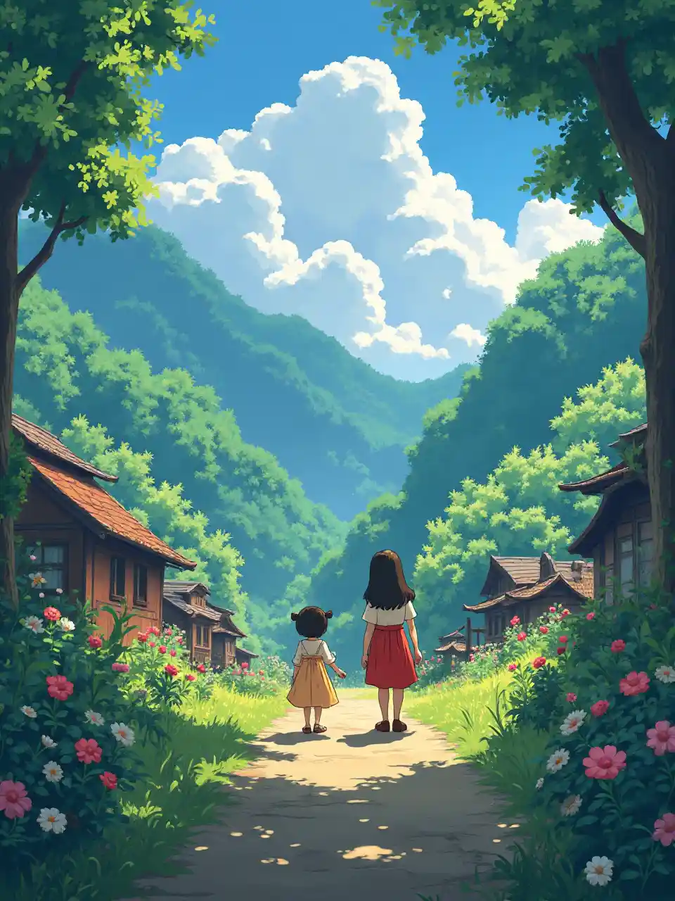 Studio Ghibli kubadilisha sanaa, capricious na enchanting, rangi hai, anga ya ndoto, mandhari nzuri ya kina, kijani kibichi, joto na kukaribisha mazingira, taa laini, hisia nyeti, ubunifu, mandhari captivating, reminiscent ya filamu ya classic, uhalisi wa kicha, hadithi ya kuvutia, ultra- kina, HD, ubora wa master.