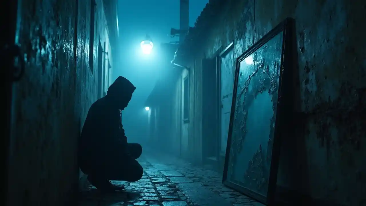 Barabara yenye giza na dhoruba inayoangazwa na taa ya barabarani ya bluu. Kamera inakaribia kwa polepole mtu aliye na kofia ya chuma ambaye anapiga magoti mbele ya kioo kilichovunjika. Katika kioo kilichovunjika, watu wenye roho wa kiumbe huyo hubadilika na kung'aa kana kwamba ni hai. Ukungu unazunguka sakafuni, na nyuso za roho zinaonekana katika mawingu ya dhoruba. Mnyororo kwenye ukuta unatikisika kwa upole. Mioyo ya watu hupiga mionzi kwa njia isiyofaa, na hivyo kuanzisha mzunguko wa kujiuliza mambo. Grunge, Gothic, surreal.