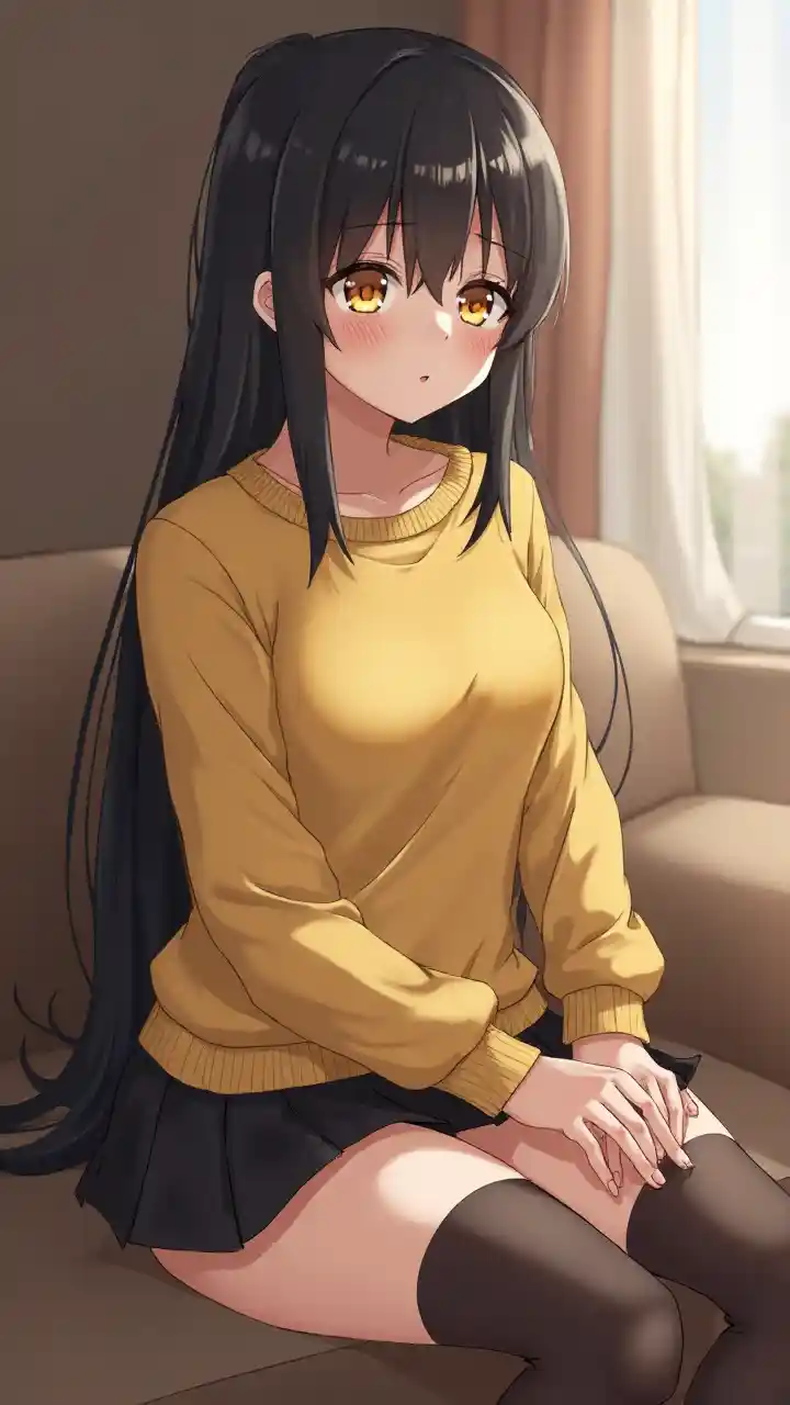 (masterpiece, ubora bora),1msichana na nywele ndefu lucious nyeusi ameketi juu ya kitanda, mikono yake miwili kushikilia goti lake, sweta ya manjano, skirt nyeusi, background blur, chupi nyeupe, cameltoe, macho ya dhahabu, blushing, kupanua miguu yake, nyeusi kiuno, nene kiuno