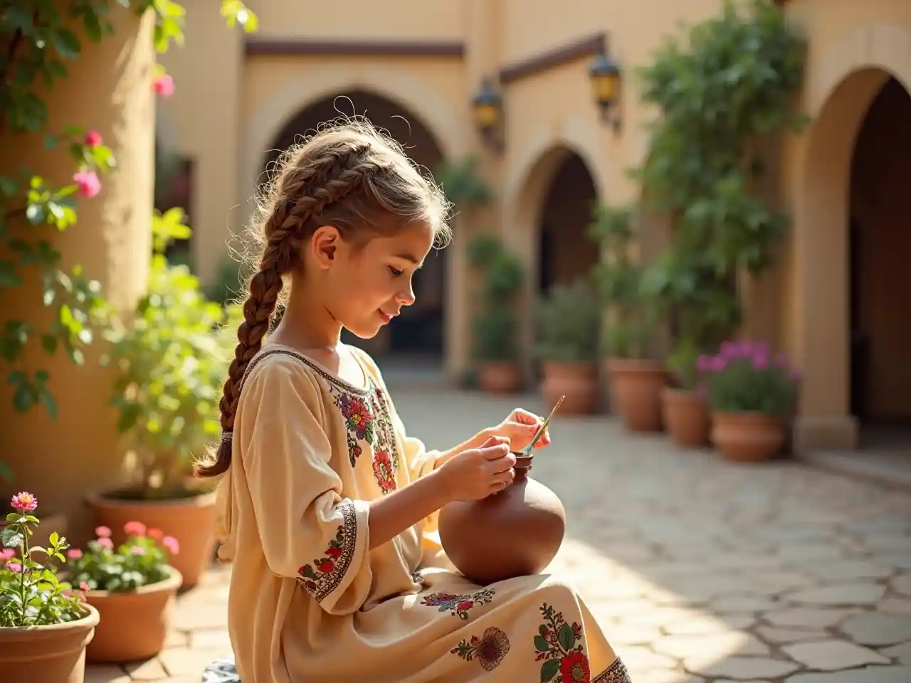 Msichana mwenye umri wa miaka 8 kutoka Mashariki ya Kati akiwa na mikunjo anavaa vazi lenye rangi ya maua. Maua yenye kupamba na matao ya mawe humweka katika mazingira yenye utulivu, na msumeno wake wenye uangalifu hutoa msukumo wa ubunifu na kuvutia kwa jua.