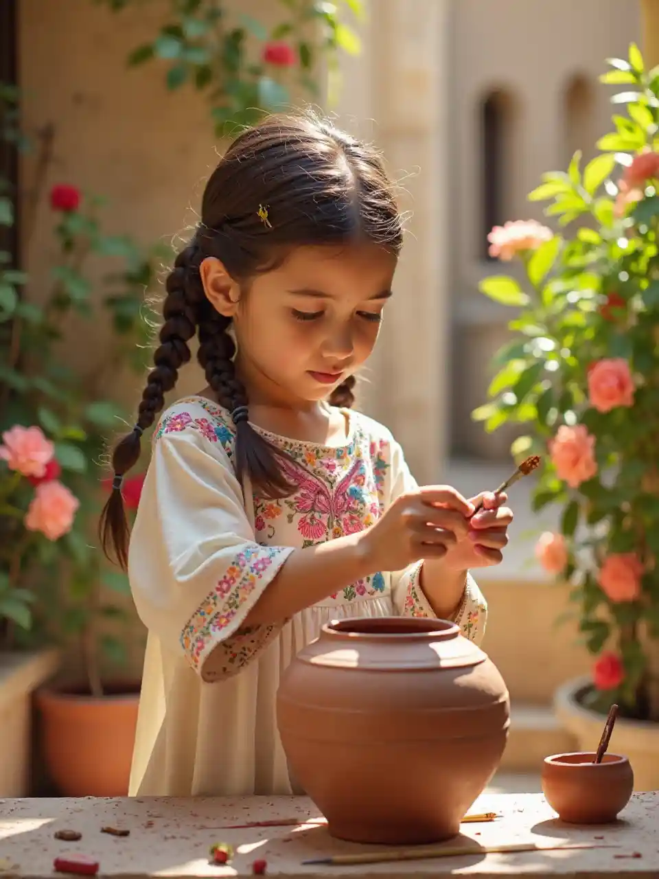 Msichana mmoja mwenye umri wa miaka 8 kutoka Mashariki ya Kati akiwa na mikunjo anavaa vazi lenye rangi ya maua. Maua yenye kupamba na matao ya mawe humweka katika mazingira yenye utulivu, na msumeno wake wenye uangalifu hutoa msukumo wa ubunifu na kuvutia kwa jua.