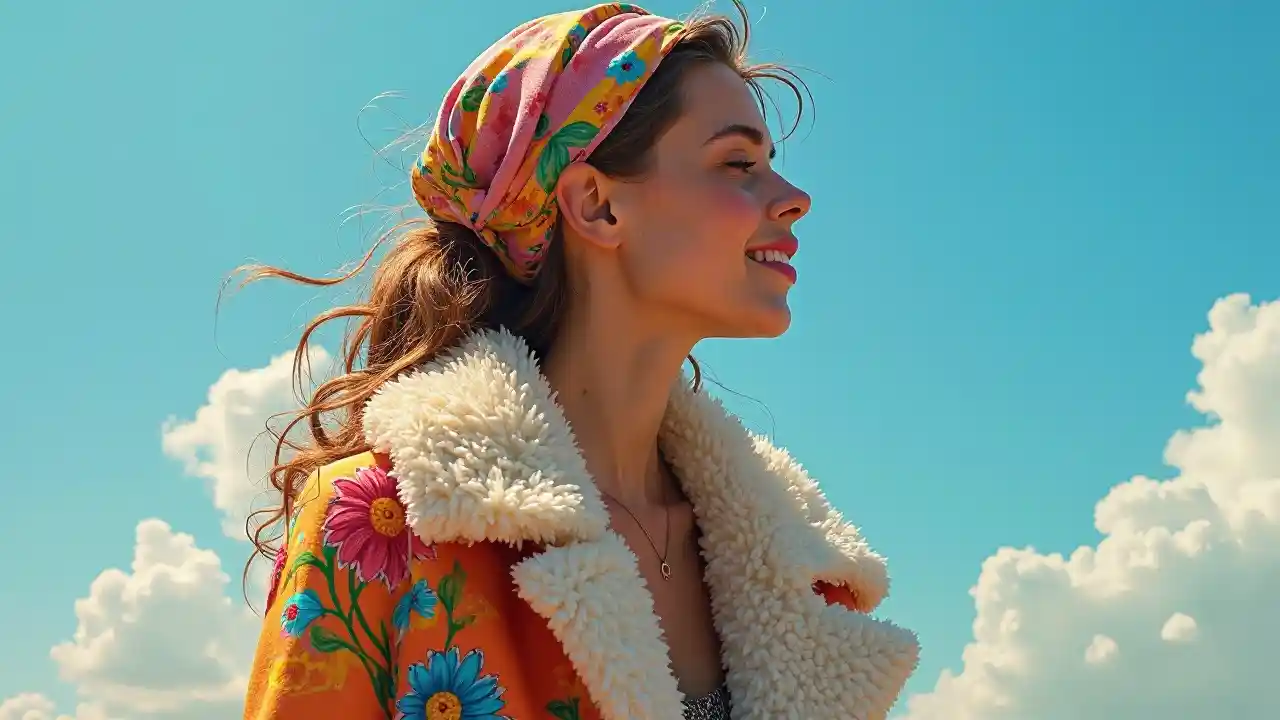 msichana ni model tabasamu, kusimama juu, amevaa kanzu ya ngozi, kanzu ya ngozi ya rangi, maua ni picha juu ya kanzu ya ngozi, kofia juu ya kichwa chake, pose kifahari, anga ya bluu, majira ya joto, smears ya rangi ya mafuta, rangi ya chini, nafaka, Masterpiece ya Joe Madureira iliyoongozwa na Magali Villeneuve, Ann Stokes, Luis Royo na WLOP, 8k Ultra HD. --s 250
