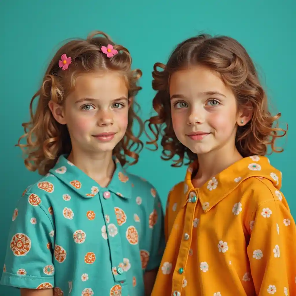 Picha ya wasichana wawili vijana kuvaa Coifs, nusu urefu, Wes Anderson style, incredibly high detail, Bright colors, Turquoise, blue, orange