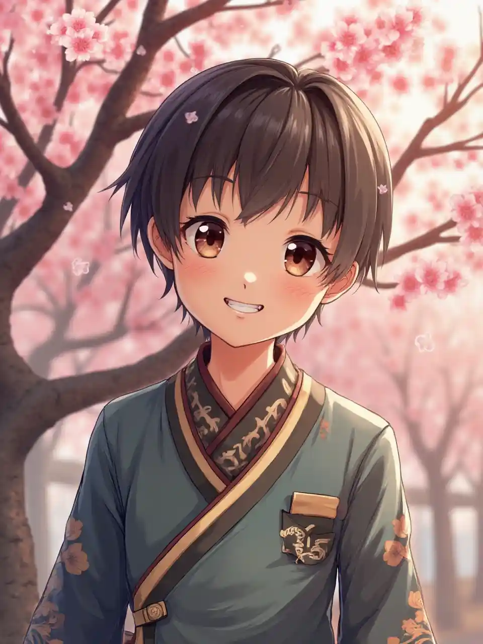 Sebastiangirt, umri wa miaka 5, tabasamu, kuangalia moja katika kamera, background cherry bloom, kina