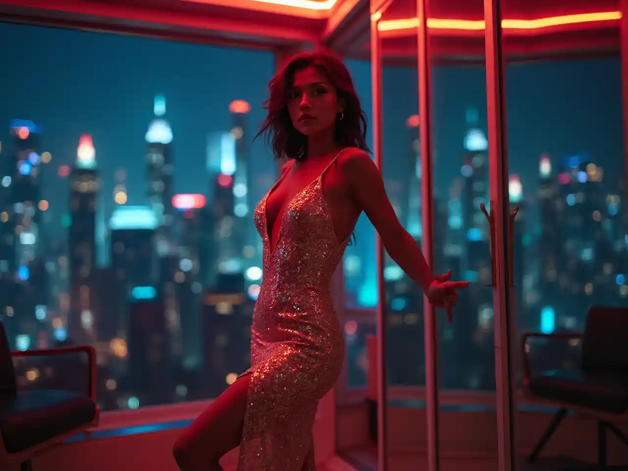 Akitoa picha katika nyumba ya juu yenye taa za neoni, mwanamke wa Asia mwenye umri wa miaka 30 hivi anavaa mavazi ya kushona. Mazingira ya jiji na kuta zenye vioo humweka katika mazingira ya kifahari ya mijini, akiwa na miguu midogo na kiuno kirefu ambacho hutoa mvuto wa kuvutia na usawa wa akili wenye kuvutia.
