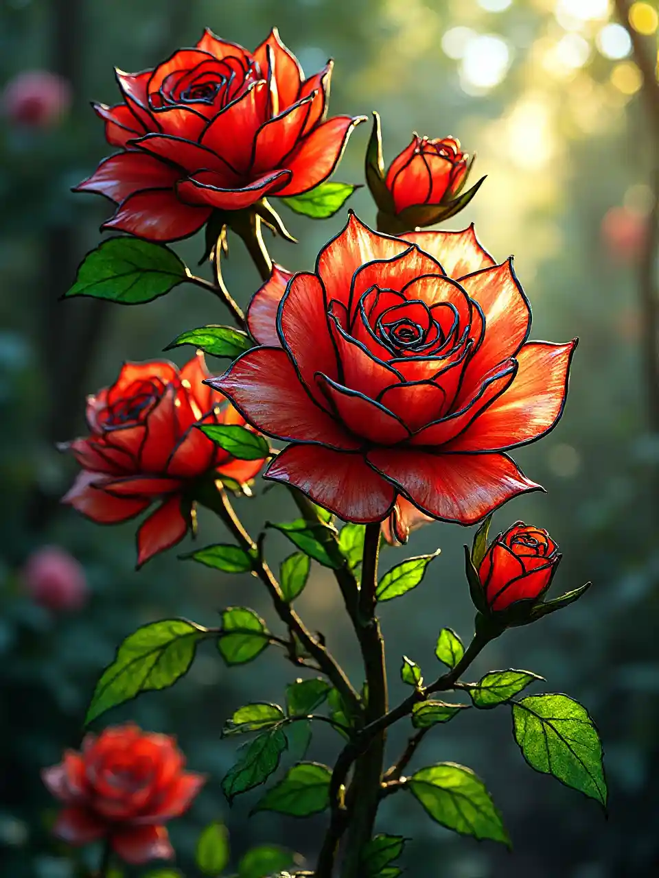 (roses kioo stained), rangi ya kupendeza, miundo tata, mwanga mkali kuchuja, petals nyeti kazi kwa usahihi, kijani tajiri kinyume na nyekundu na pink, anga ethereal, maelezo ya kuvutia, (kwa kina) texture, miundo ya kioo ornamented, joto taa casting vivuli laini, muundo kifahari na ya, uzuri wa muda mrefu, (4K) ufundi ultra-maele.