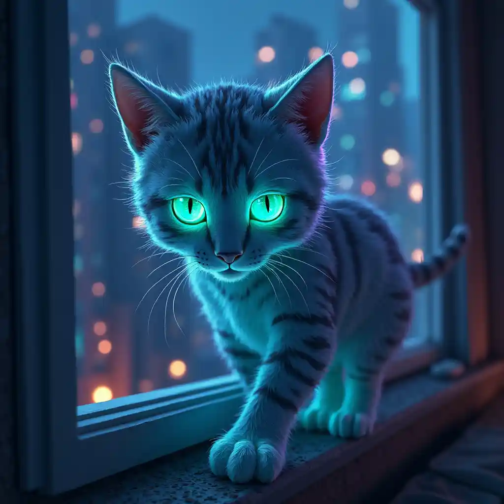 paka cute nyumba ((iliyotengenezwa kutoka taa neon kung'aa)), macho kung'aa ((na mwanga sana neon bluu na kijani)), mfano wa ngozi ya ajabu ((mapanga nyeupe na kula tips)), kutembea kando ya dirisha ((wideshot cinematic kamera angle)) mji wa kina wa kina, Hyper kweli, maelezo ya wazi, nywele za kina, mwili wa kina, rangi wazi, mbali kamera, rangi nywele, picha safi, azimio la 4k, 1240p 1080p, ufafanuzi wa juu, rangi ya anime sanaa 5 vido