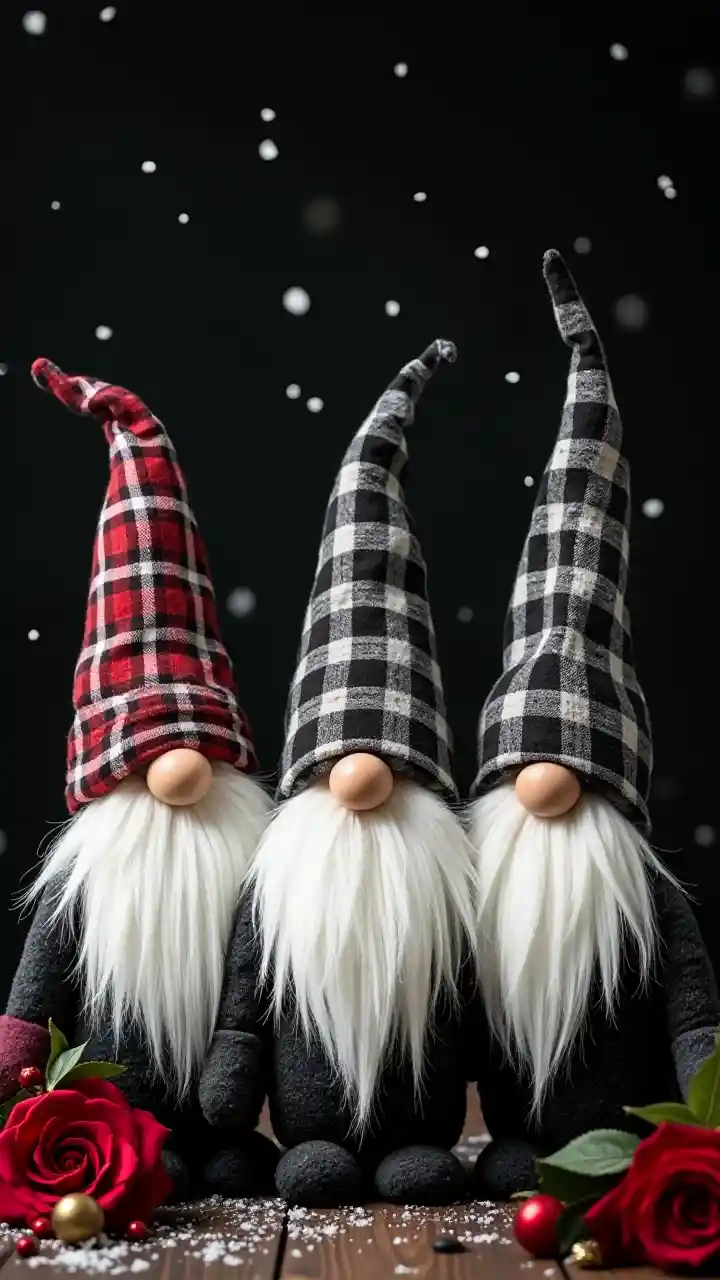 Viumbe watatu wadogo wenye kupendeza wakiwa na kofia zenye mistari nyeusi na nyeupe, wakiwa wamesimama pamoja juu ya mandhari nyeusi huku vipande vya theluji vikianguka kwa upole kuzunguka. Roses nyekundu na rangi nyeusi za kung'aa huongeza mshangao wa sherehe kwenye mandhari hii ya Krismasi, yenye uhalisi mwingi, yenye maelezo mengi na yenye ubora wa juu.