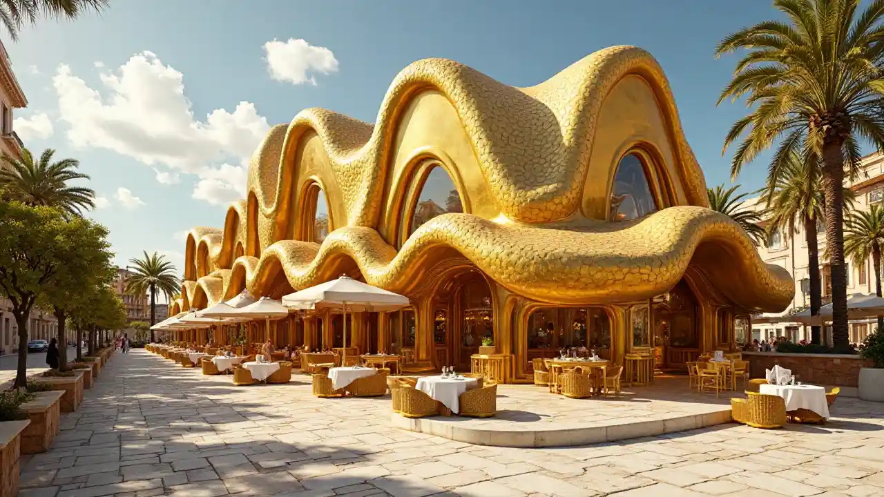 /ndoto prompt: kubwa viewing angle lenses ya dhahabu palette hyper realistic neocosmic anasa nje usanifu wa mlo mistari Fluid dhahabu facade, Antoni Gaudi Berndnaut Smilde Dale Chihuly usanifu mitindo, Sahara mazingira, siku ya jua, katika mji wa Roma, anga ya bluu, hyper kina, mwanga wa asili, kamera Nikon, 8k, --s1000 --style original