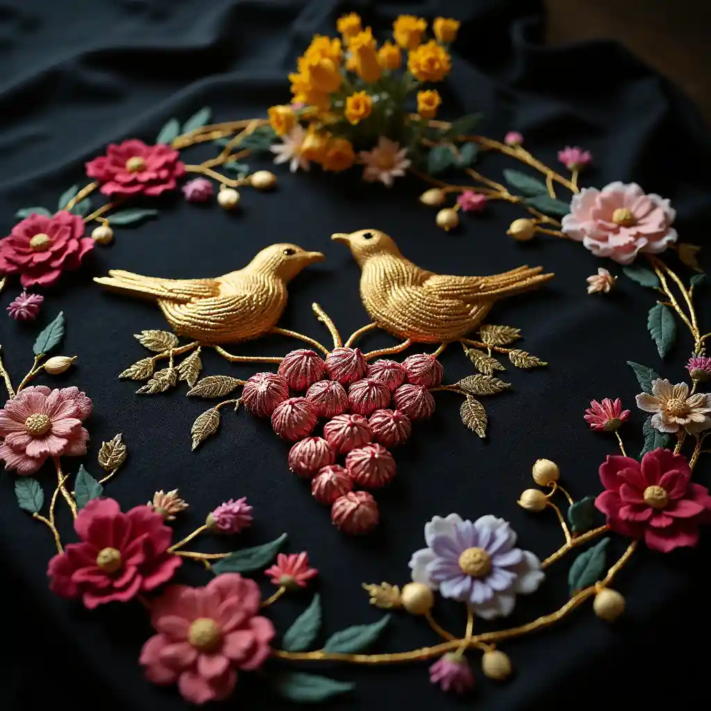 picha ya embroidery katika uzi wa dhahabu ya chuma, kuwakilisha zabibu na ndege, Sevillian Baroque style, kawaida ya Wiki Kuu katika Seville, juu ya kitambaa cha rangi ya kijani, na vivuli busara na kiasi, kuzungukwa na frame ya maua ya asili, embroidered katika uzi wa, rangi mkali na furaha, kina sana, focus, anga, kina cha uwanja, ubora wa picha, azimio la juu, graphic style, utamaduni, kifahari, mtindo,