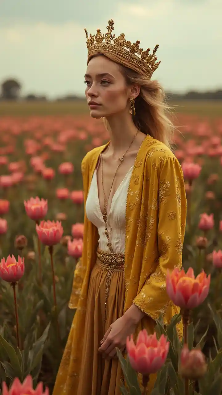 Malkia wa dhahabu akiwa amesimama katika shamba la protea. Weka uso kutoka picha ya kumbukumbu