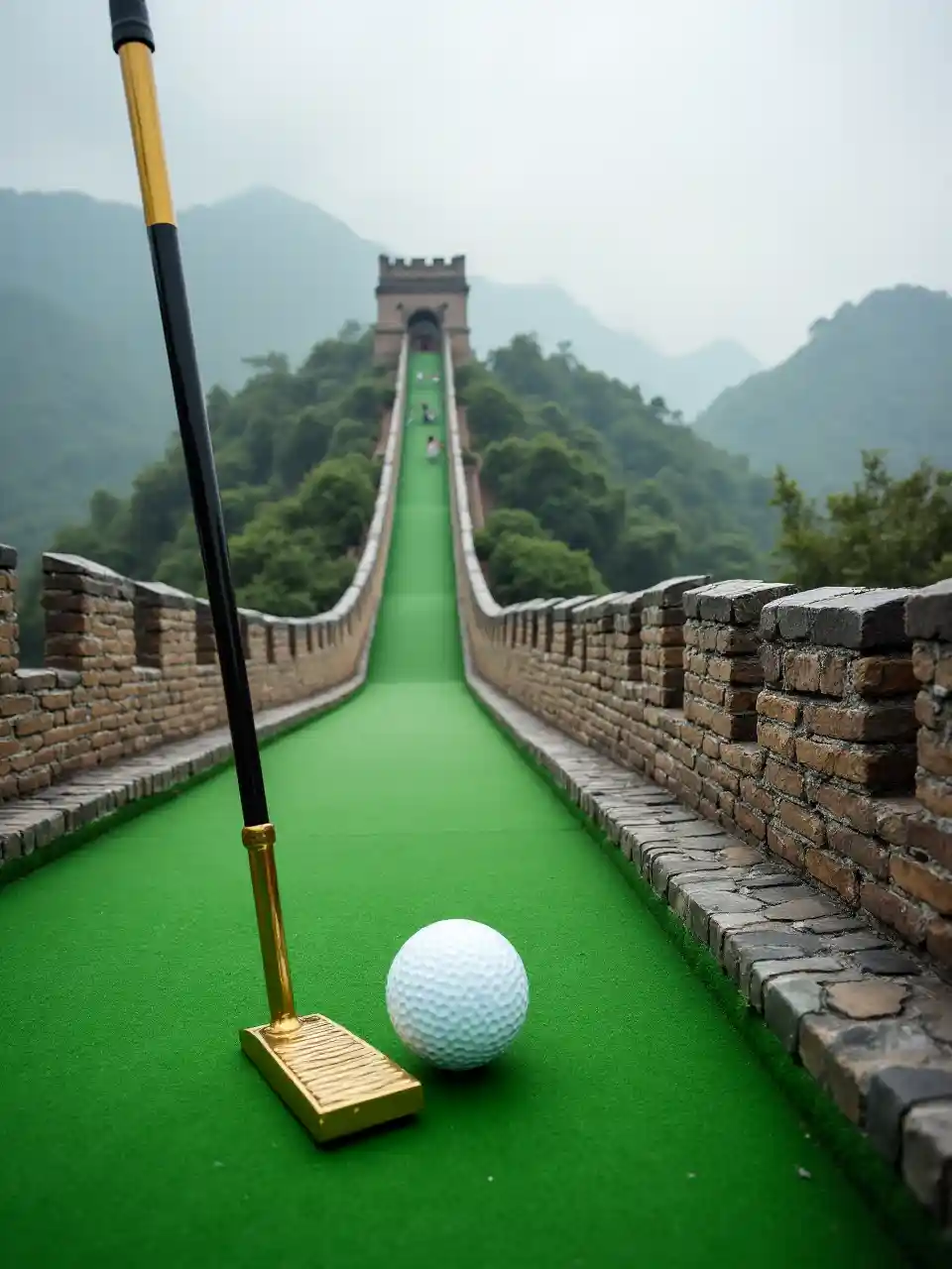 Picha ya Ukuta Mkubwa wa China, lakini sasa sehemu ya uwanja wa mini golf, ikiwa ni pamoja na mpira na golf