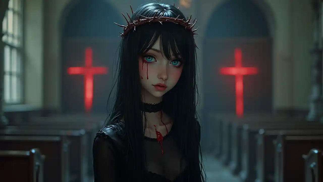 Msichana gothi Picha ya kweli, msichana mzuri wa miaka ya utineja, mwenye ngozi nyeupe, macho ya bluu, nywele ndefu nyeusi, taji ya miiba inayoingia kwenye kichwa, mwili mzima, unajiona na pentagramu ya rangi ya bluu, mwili mzima, macho ya bluu, unajiona katika kanisa.