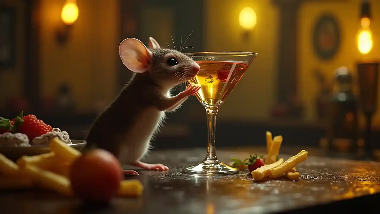 ndani ya glasi ya martini karibu na panya mdogo glasi ya martini akiinua, glasi iko kwenye meza ya bar iliyojaa keki ya matunda na fries, sanaa ya dhana ya giza, kuta za kasmir na kupumua, nyuma ya mchezo wa uovu, palette ya usiku, kuvaa gothic, rangi nyeusi, mavazi ya gothic, maeneo, vidid snowwhite yellow silver red colors