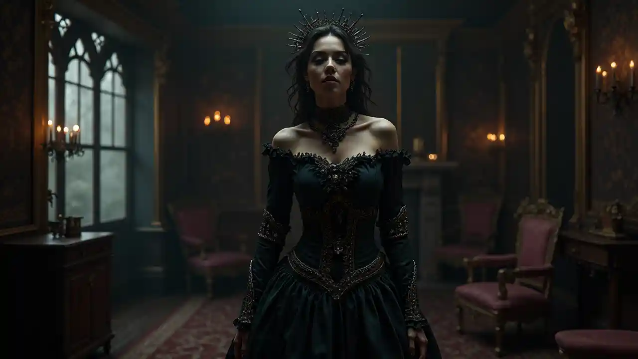 Photorealistic, picha filamu noir style, high tofauti vivuli, rangi ya giza tajiri, gothic-themed mwanamke katika goro goro goro, amesimama katika chumba gothic, mapambo na mapambo gothic, aliongoza na kazi ya sanaa ya Anne Stokes, anga evo, taa moody, haunting bado dramatic composition, ultra-detailed and immersive scene, capturing the essence of gothic aesthetic.