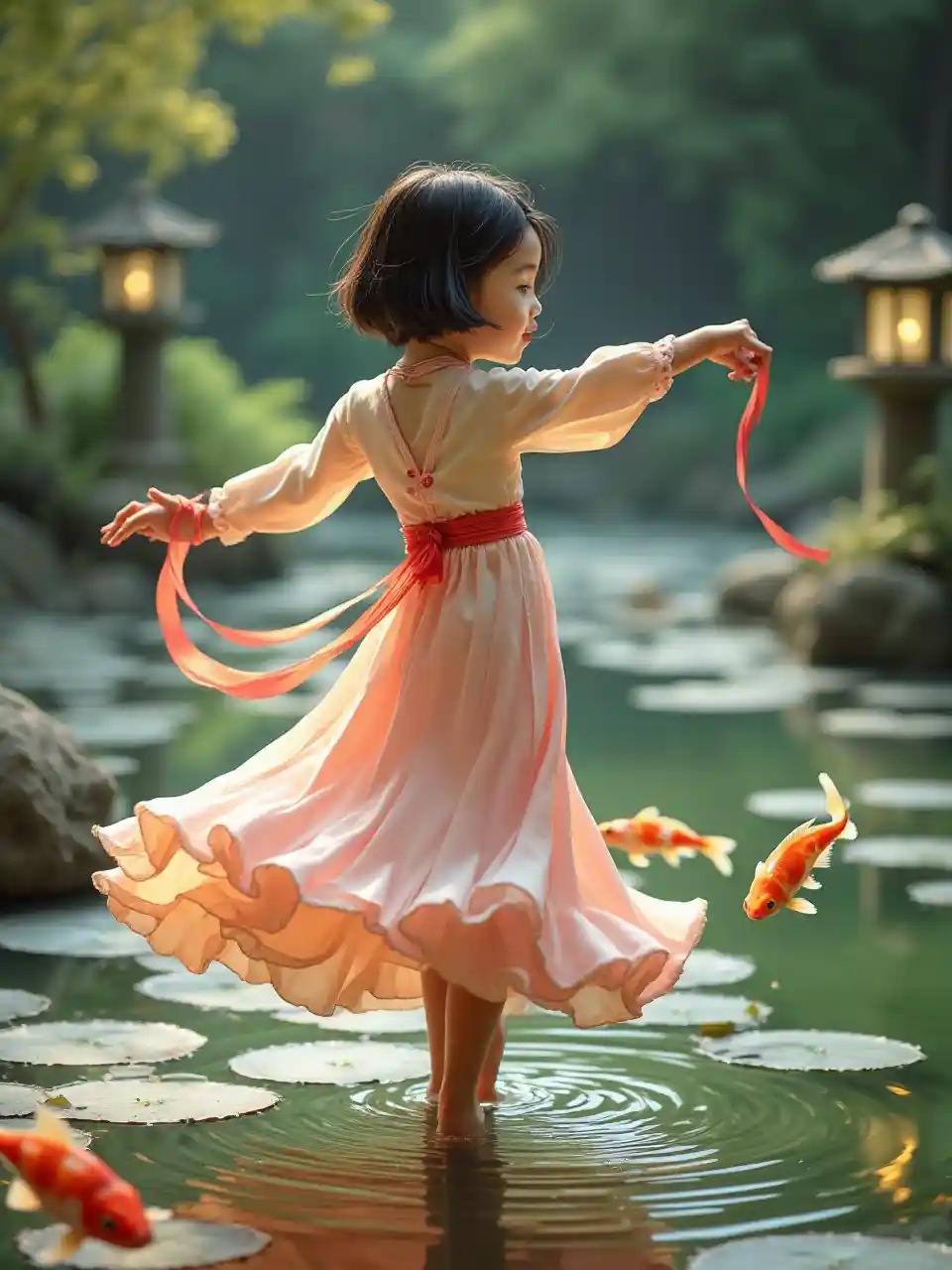 Msichana mmoja wa Asia mwenye umri wa miaka 7 mwenye nywele za bob, anacheza dansi akiwa na mkanda wa rangi ya rangi ya rangi ya rangi ya rangi ya rangi ya rangi ya rangi ya rangi ya rangi ya rangi ya rangi ya rangi ya rangi ya rangi ya rangi ya rangi ya rangi ya rangi ya rangi ya rangi ya rangi ya rangi ya rangi ya rangi ya rangi ya rangi ya rangi ya rangi ya rangi Samaki wa aina ya koi na taa za mawe humweka ndani ya sanamu, na mizunguko yake yenye neema hutoa umaridadi na kuvutia kwa kucheza katika mazingira ya kawaida.